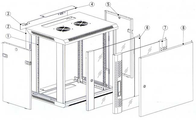1. Mounting rail 2. Frame 3. Mounting panel 4. Cable entrance cover 5. Side door 6. Toughed glass door 7. Toughed glass door with vented borders 8. Steel doors |