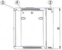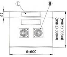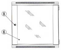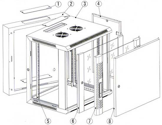 1. Cable entrance cover 2. Back part 3. Frame 4. Side door 5. Mounting rail 6. Toughed glass door 7. Toughed glass door with vented borders 8. Steel door 9. Cooling fan |